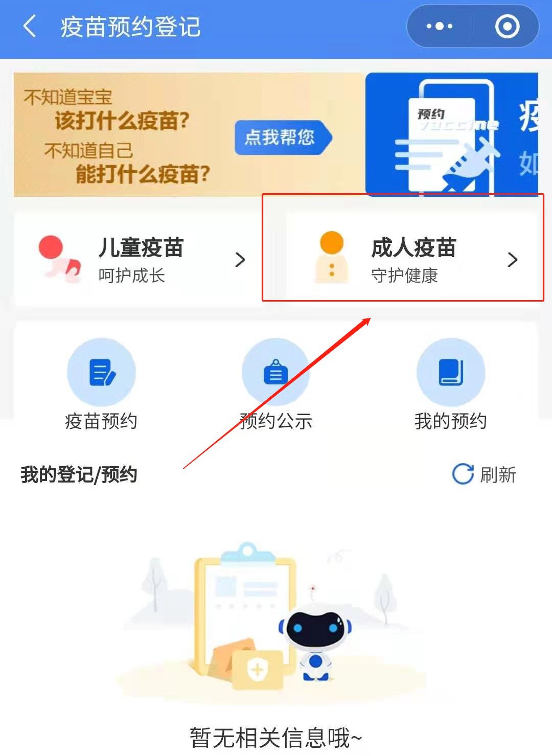 点击“疫苗预约”,选择上方“儿童疫苗”或“成人疫苗”进行预约登记;