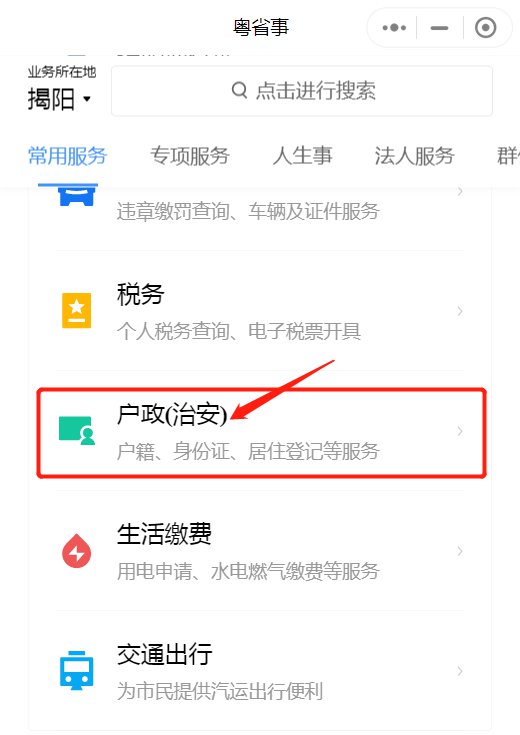 1.进入粤省事小程序(点此进入),下拉找到“户政(治安)”点击进入