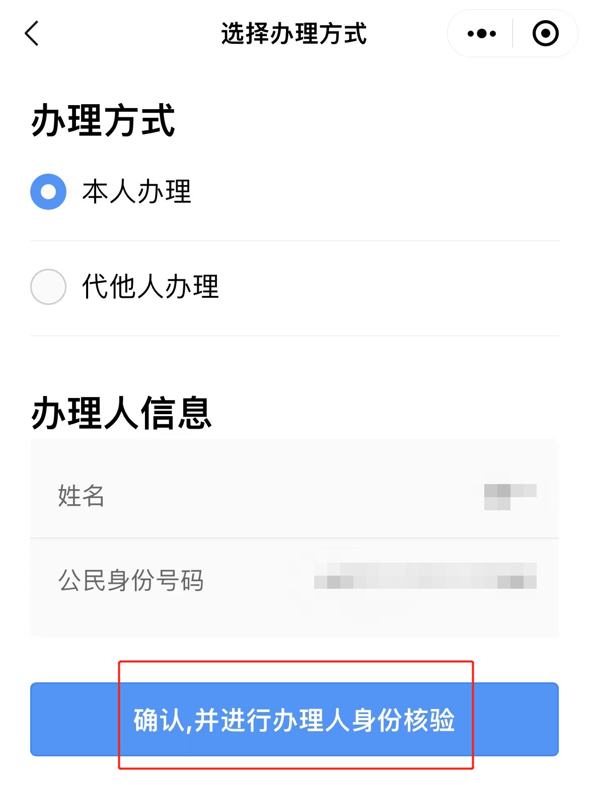 4.选择本人办理或代他人办理,点击“确认,并进行办理人身份核验”。