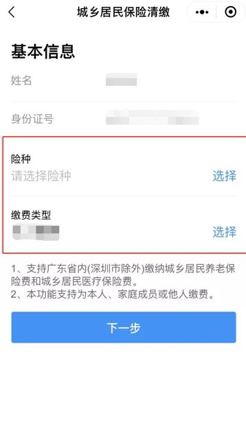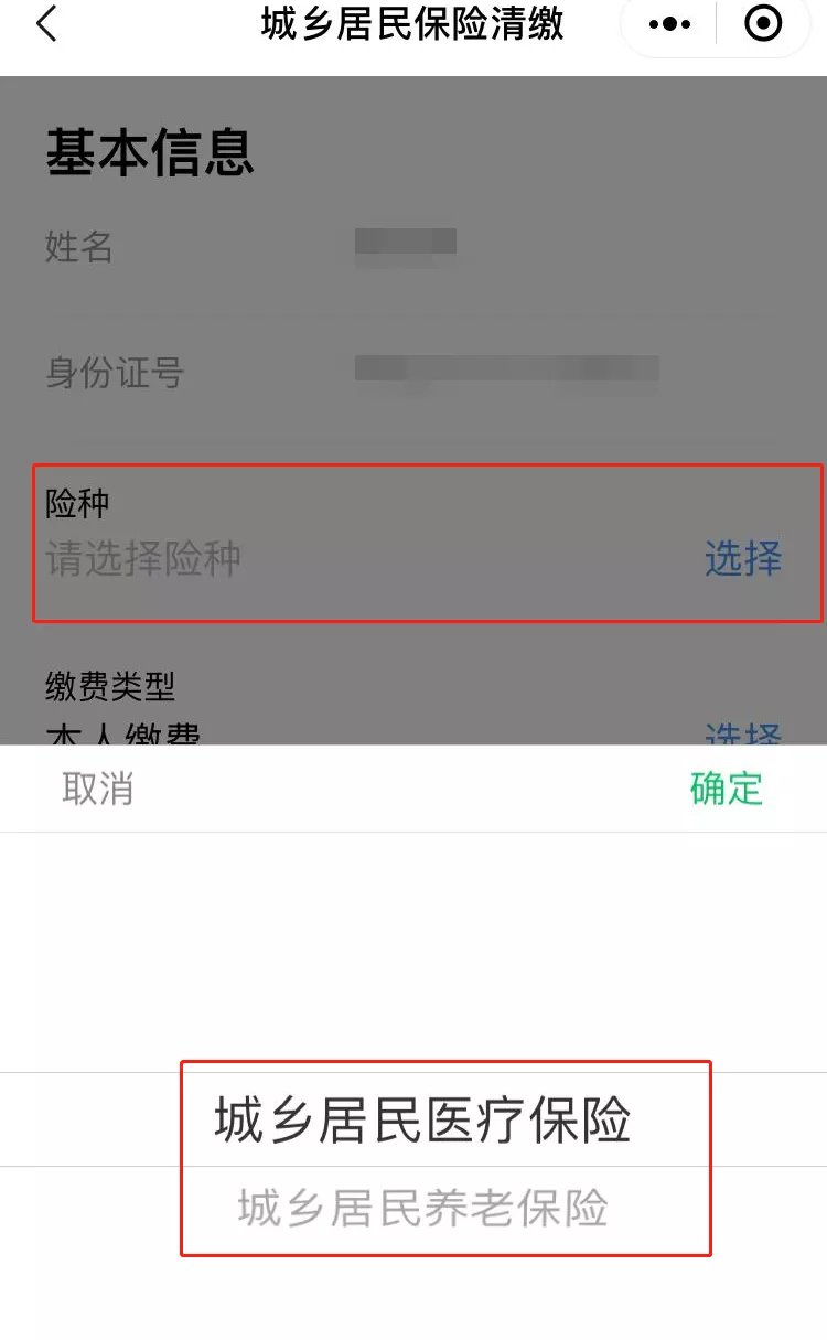 2.进入基本信息界面,选择相关险种 :“城乡居民医疗保险”或“城乡居民养老保险”;选择缴费类型:“本人缴费”、“家庭缴费”、“代他人缴费”。