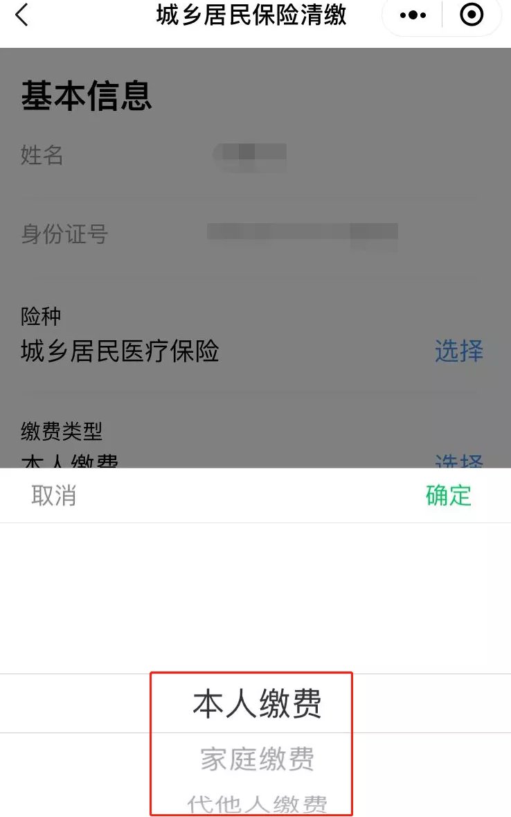 选择“代他人缴费”,要进入户籍信息界面,输入被代缴人信息;选择“家庭缴费”,要进入基础信息界面。
