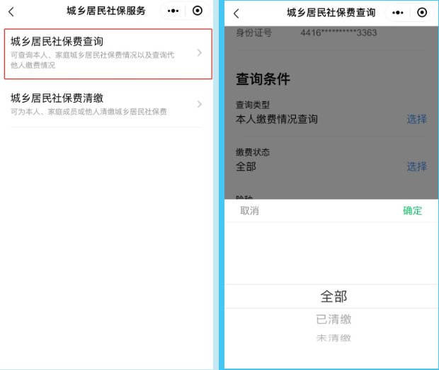 (1)点击“城乡居民社保费查询”,选择查询类型、缴费状态、险种等信息,可查询全部、已缴清、未缴清的所属期限及金额。