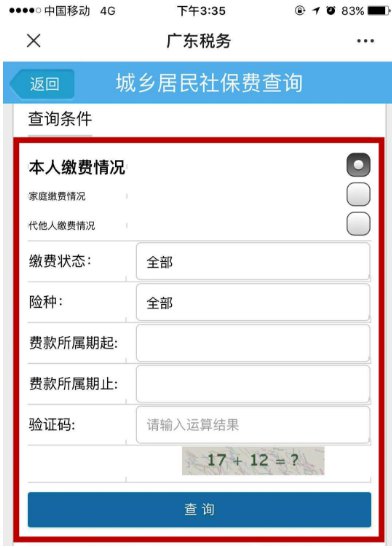 在“粤税通”小程序,登录并进行实名认证。认证完成后,点击【城乡居民社保】,选择【城乡居民社保费查询】,选择险种、所属期起止日期,即可查询。