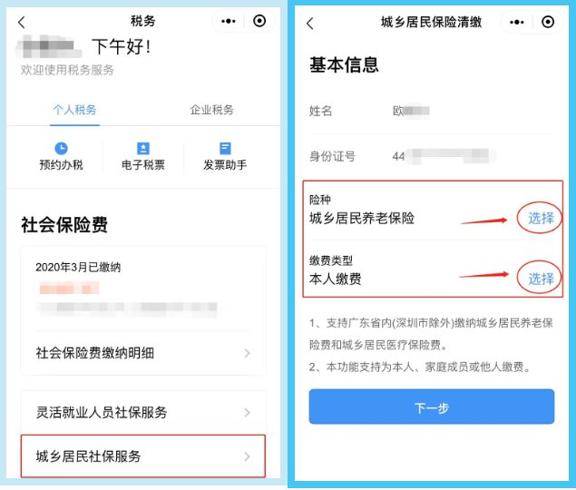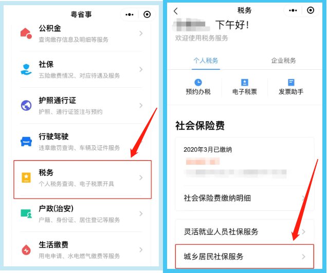 第二步:在首页点击“税务”服务,在“个人税务”版块找到“社会保险服务”——“城乡居民社保服务”。