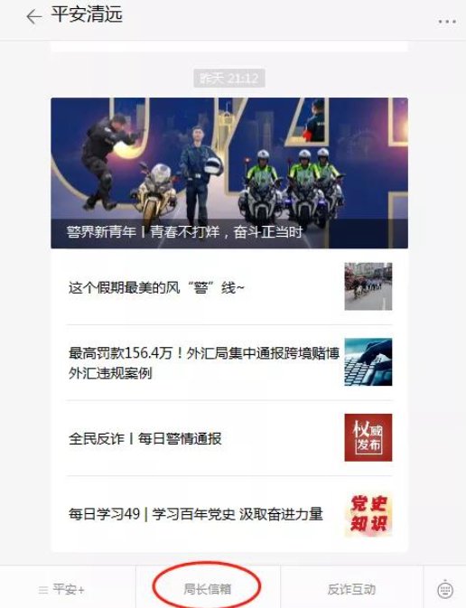 2、关注“平安清远”微信公众号菜单栏下方“局长信箱”