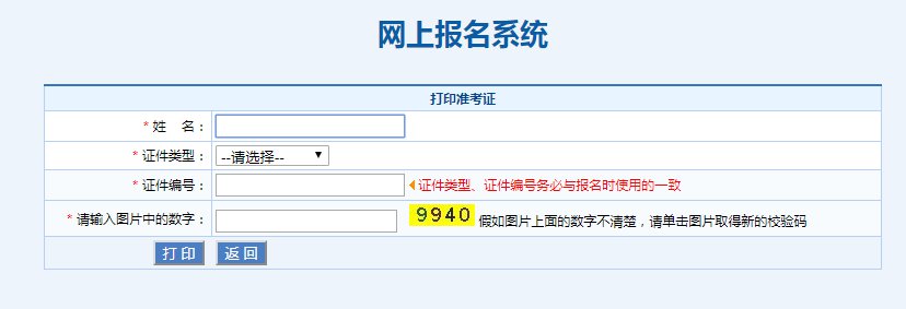 第三步:输入姓名、证件号及相关信息,然后就可以打印准考证,如下图所示:
