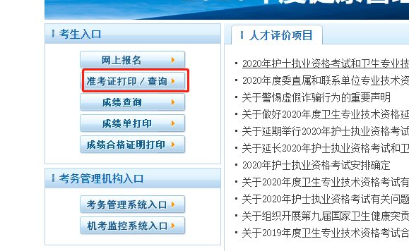 第一步:进入中国卫生人才网,点击”准考证打印/查询“,如下图所示:
