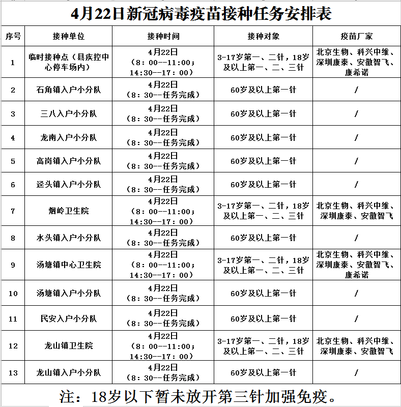 4月22日,佛冈县开放新冠病毒疫苗接种门诊有: