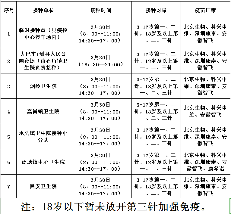 3月30日,佛冈县开放新冠病毒疫苗接种门诊有: