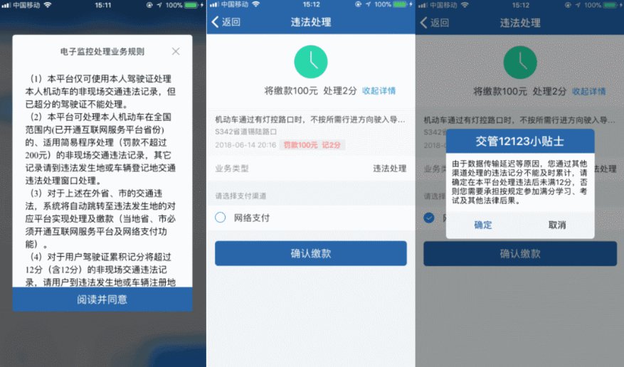 第二步:用户选择待处理违法记录后,点击【处理并缴款】,认真阅读违法处理业务须知并点击【阅读并同意】,进入待处理违法记录确认及缴款方式选择页面。