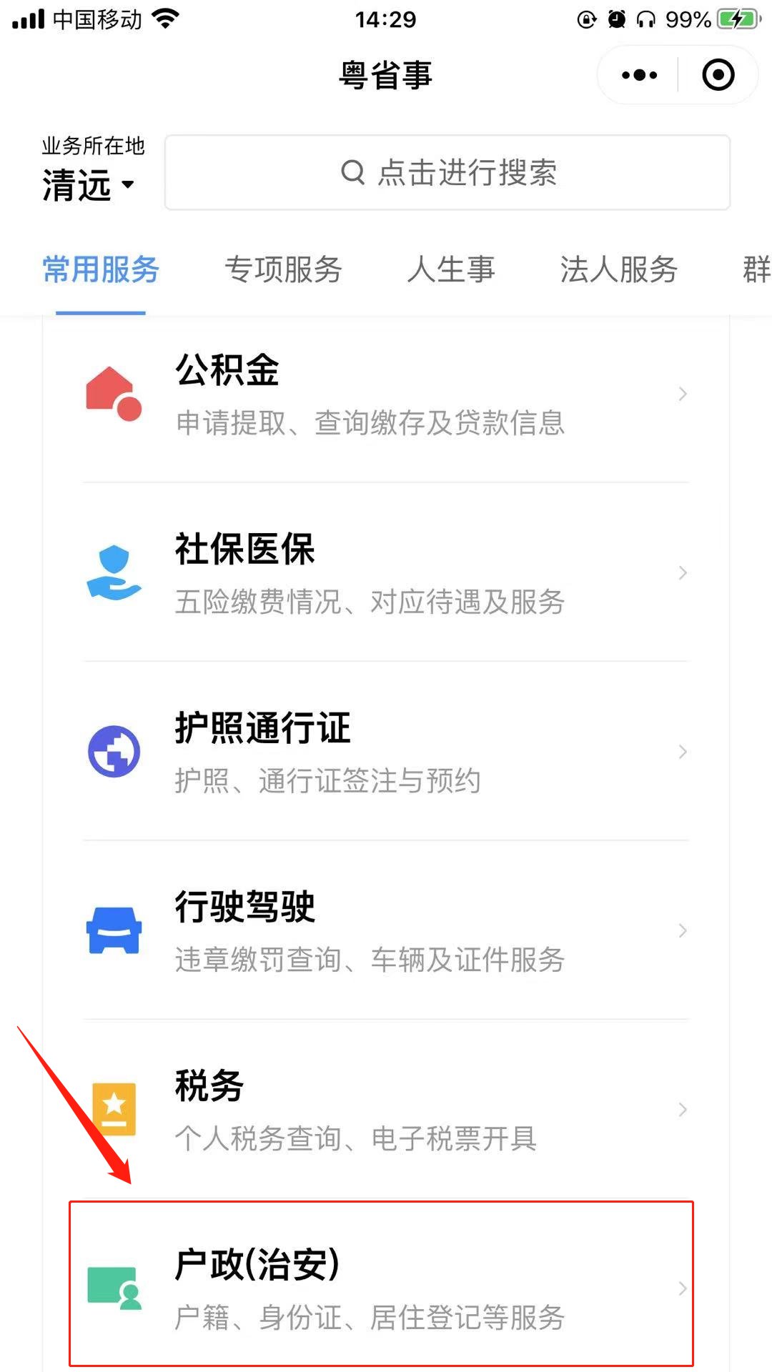 1、打开微信“粤省事”小程序,在【常用服务】中找到“户政(治安)”;