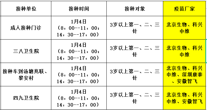 1月4日,佛冈县开放新冠病毒疫苗接种门诊有: