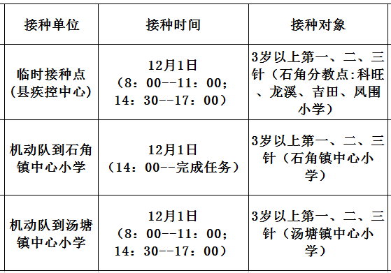 12月1日,我县开放新冠病毒疫苗接种门诊有: