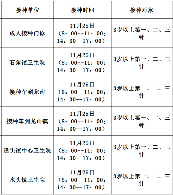 11月25日,佛冈县开放新冠病毒疫苗接种门诊有: