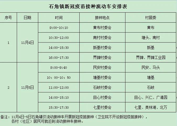 明天(11月4日)石角镇卫生院正常开展0-3岁儿童计划免疫接种(因3-11岁儿童即将开展新冠疫苗接种,3岁以上儿童暂停常规免疫接种);本院暂停新冠疫苗接种,11月4日-5日流动车开展新冠疫苗接种,具体安排如下: