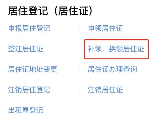 2、在“居住登记(居住证)”一栏选择“补领、换领居住证”;