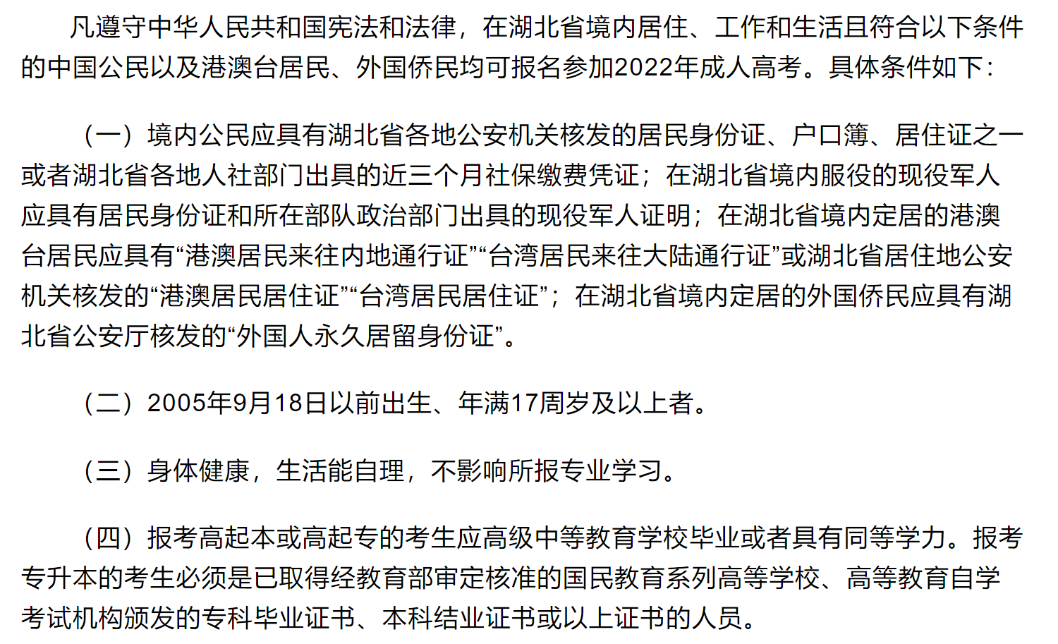(一)报名对象:凡遵守中华人民共和国宪法和法律,在湖北省境内居住、工作和生活且符合以下条件的中国公民以及港澳台居民、外国侨民均可报名参加2022年成人高考。