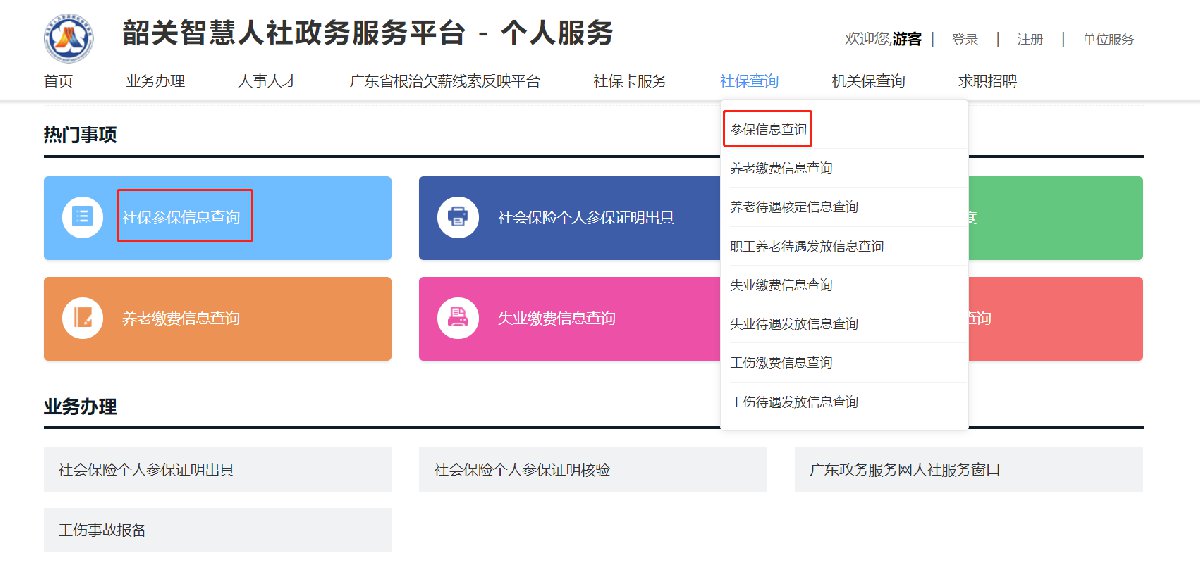 1、点击链接进入“韶关12333人力资源社会保障服务网”,点击“个人服务”中的“社保参保查询”。