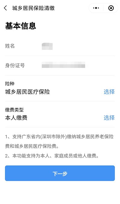 填写基本信息,险种选择【城乡居民医疗保险】,缴费类型可选择本人缴费、家庭缴费以及代他人缴费,结束后点击下一步即可。