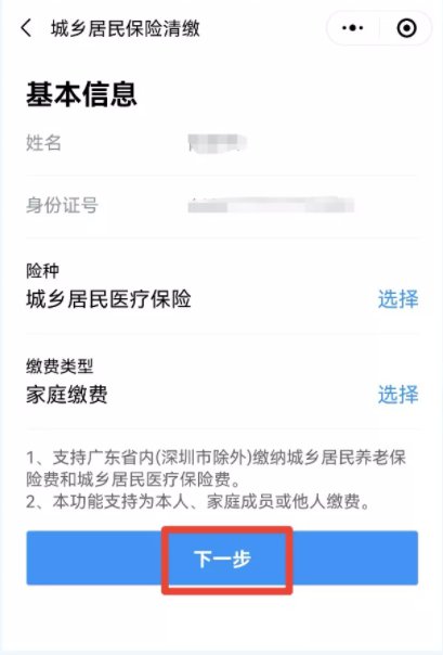 进入城乡居民保险清缴界面,选择缴费险种、缴费类型,其中缴费类型包括“本人缴费”“家庭缴费”“代他人缴费”“代其他家庭缴费”。选择“家庭缴费”可为同一户籍下所有参保人缴费,点击【下一步】。