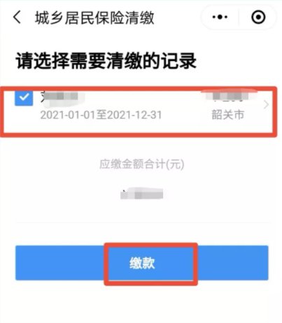 进入城乡居民保险清缴界面,点击缴费金额可查看缴费明细,勾选清缴记录,点击【缴款】。