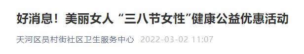 三八节期间,为表达对女性同胞的真切关怀和真诚祝福,让更多女性得到健康呵护和提高生活品质,员村街社区卫生服务中心将开展多重女性健康优惠活动,在节日里给全体女性同胞送上一份健康,其中一个优惠活动是妇科活动: