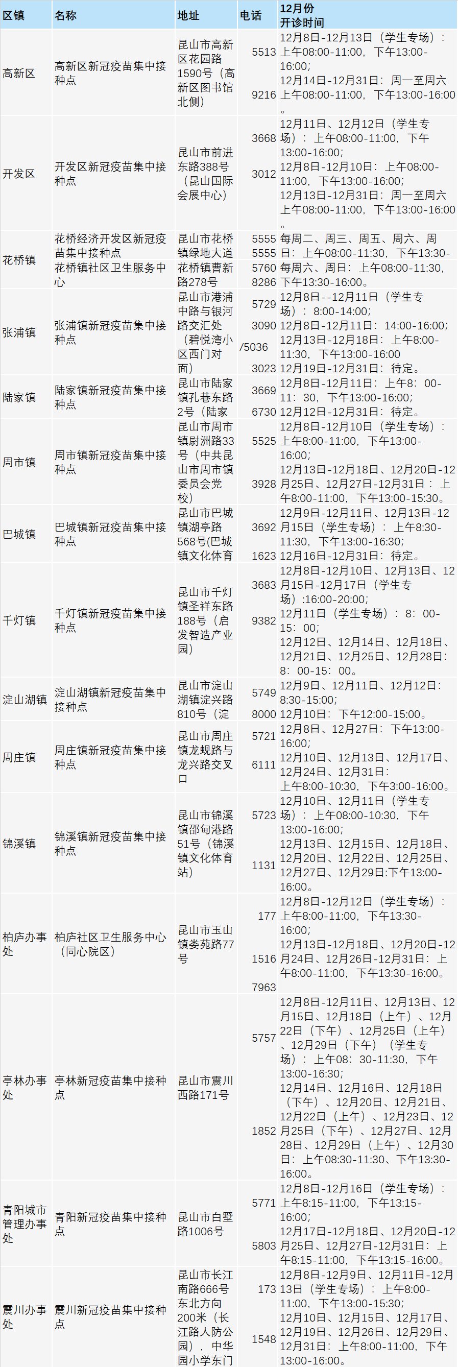 12月份昆山市新冠疫苗接种点开诊信息
