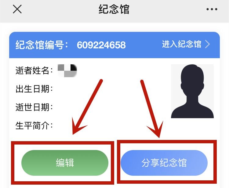 (8)点击“编辑”修改信息点击“分享纪念馆”邀请亲友共同祭扫
