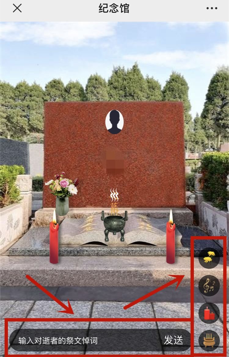 (6)点击“右侧菜单栏”为逝者献上鲜花、音乐、蜡烛、香炉点击“下方对话框”输入悼词