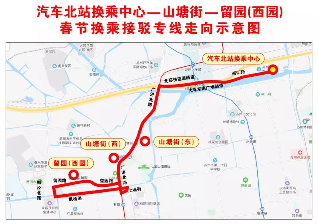 2、“好行”驳载车辆线路走向:汽车北站换乘中心→山塘街公交站台(西侧)→留园景区(西园)→山塘街公交站台(东侧)→汽车北站换乘中心。