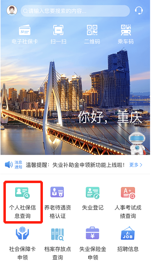 第一步:下载“重庆人社”APP,下载后进入,在首页点击”个人社保信息查询“。