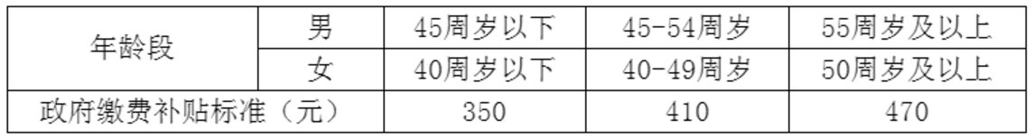 2.政府缴费补贴:政府对参保人员缴费给予补贴,补贴标准根据参保人员所属年龄段(以缴费当年12月31日本人周岁年龄为准)设定,见下表: