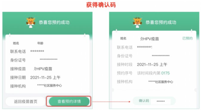 4、预约成功:预约成功后,点击“查看预约详情”,获得确认码,之后请携带相关证件,按预约时间准时前往接种点接种。