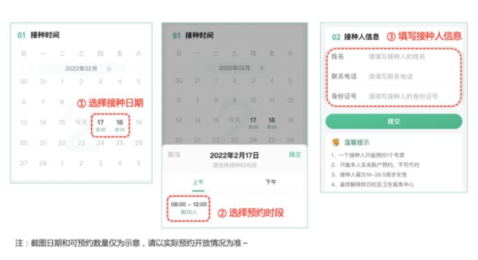 3、填写预约信息:选择接种日期和时间,填写接种人信息:姓名、身份证号、手机号码,系统会在线核实是否符合疫苗接种条件,是否本人实名账户,只有符合条件的用户才可进行预约。请根据自身需求选择预约接种时间,并认真填写预约信息(很重要!)