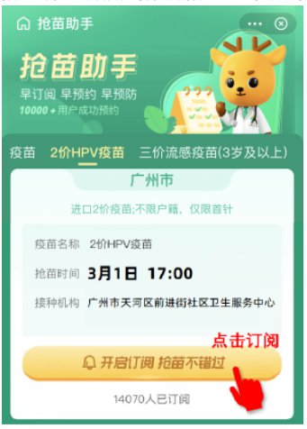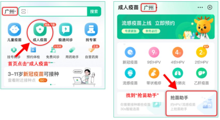 2、进入医鹿APP首页,选择“广州”地区,点击“成人疫苗”,点击“抢苗助手”,进入抢苗助手页面。
