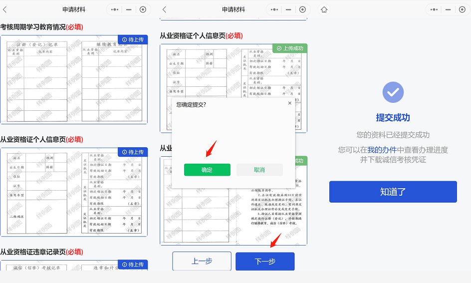 申请人根据页面展示的上传材料示例,上传格式为png、jpg,大小不超过10M的图片并确保上传的电子影像清晰可见。上传成功的材料,右上角会显示“上传成功"字样。上传完成并确认无误后点击【下一步】进行提交。