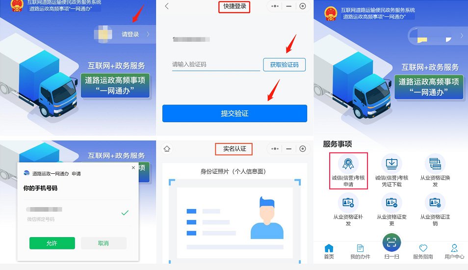 登录"道路运政一网通办"小程序后,通过【服务事项】→【诚信(信誉)考核申请】,进入道路运输驾驶员诚信(信誉)考核业务流程。