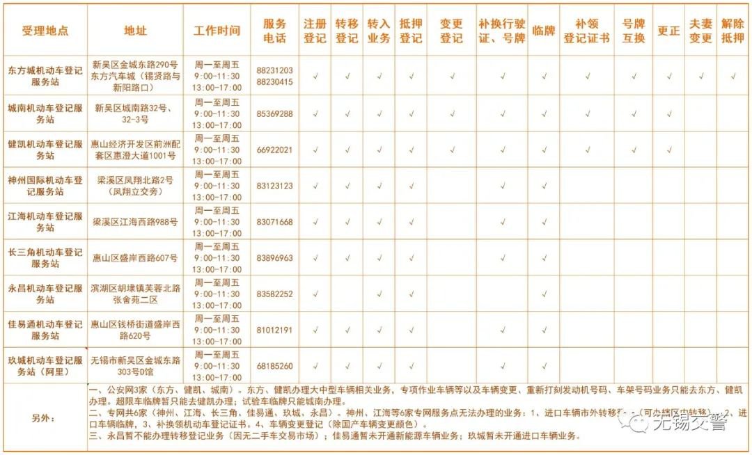 注意:无锡市区摩托车业务到东亭综合科办理(梁溪区江海西路201号、服务电话:88700757)。