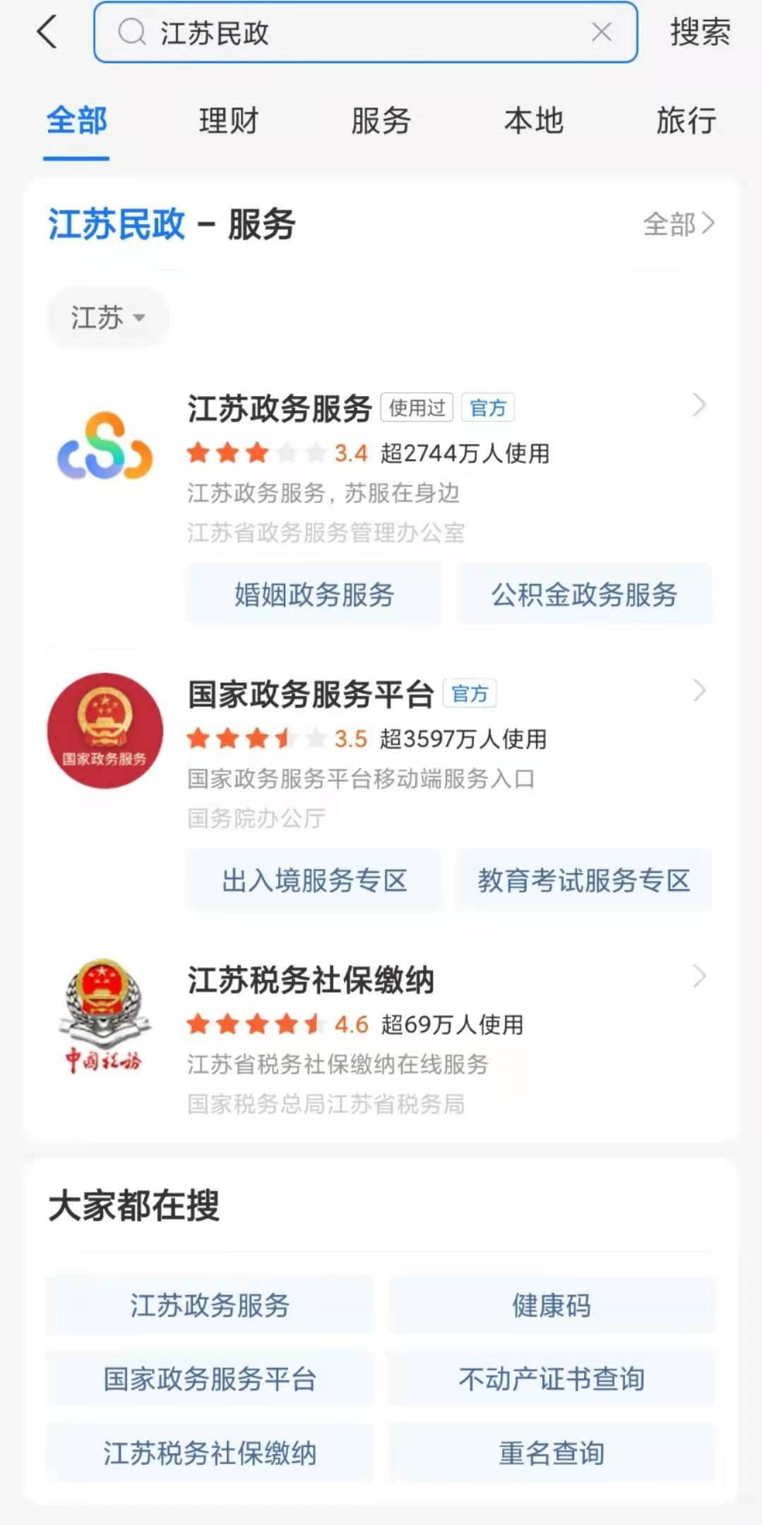 (二)支付宝搜索“江苏民政 ”,点击进入“婚姻登记预约应用”,进行线上预约办理