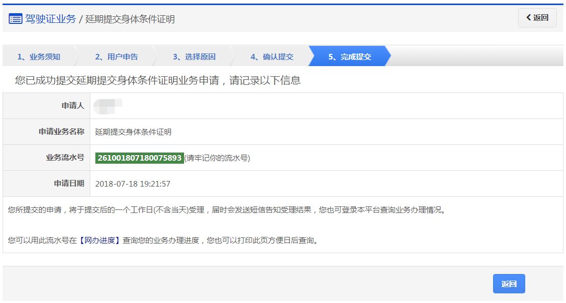 该步骤提交成功后,系统生成业务流水号。该步骤提交成功后,系统将于提交后的一个工作日(不含当天)受理,届时会发送短信告知受理结果。用户可以根据该业务流水号在网办进度中查询业务办理进度。办理成功后,用户如需延期回执,可通过网办进度下载或自行到车管所窗口打印。