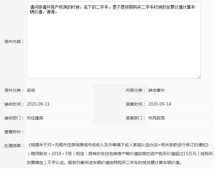 《根据关于对<无锡市住房保障城市低收入及中等偏下收入家庭认定办法>相关条款进行修订的通知》(锡民联发﹝2018﹞5号)规定:拥有的非住宅类房产等价值较高的资产购买价值超过15万元(按购买时发票确定)不予认定。服务对象所述车辆价值按照购买二手车时候发票计算车辆价值。