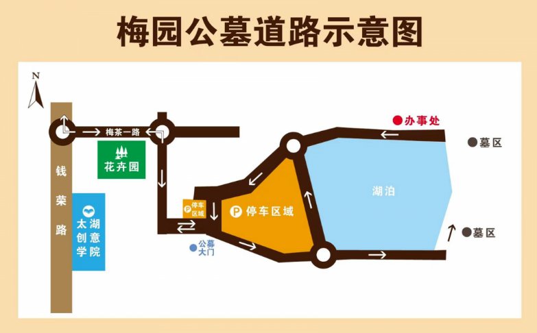 进入墓区车辆一律从钱荣路梅茶一支路口进入,墓区内逆时针循环,出墓区车辆原路上钱荣路。视情控制钱荣路南北匝道往梅园方向车辆。