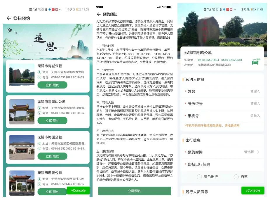 2、选择无锡梅园公墓,查看预约须知,点击“立即预约”,按照页面提示,填写预约人姓名、身份证号、手机号、预约时间、出行方式、随性人员信息,健康信息等