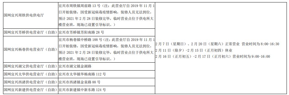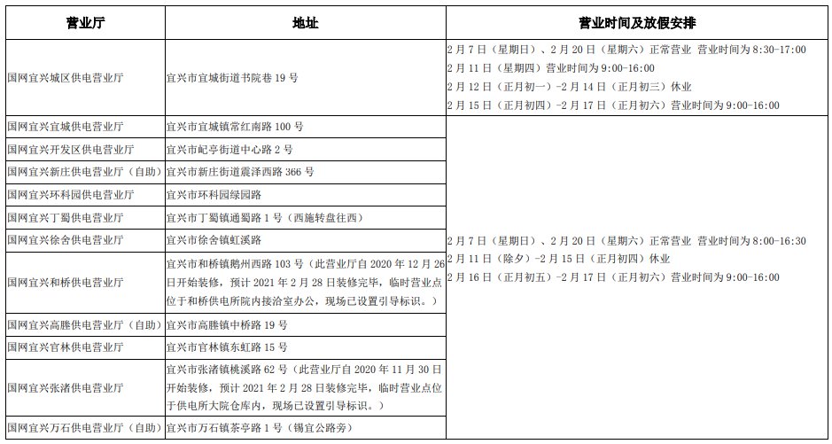 2021年春节期间,宜兴市供电公司城中营业厅开放24小时自助服务区,法定休业期间所有营业厅安排工作人员值班轮守,大年初四(2月15日)起城中营业厅对外正常营业,大年初五(2月16日)起农村营业厅对外正常营业,持续为广大用户提供贴心周到的各项电力服务。