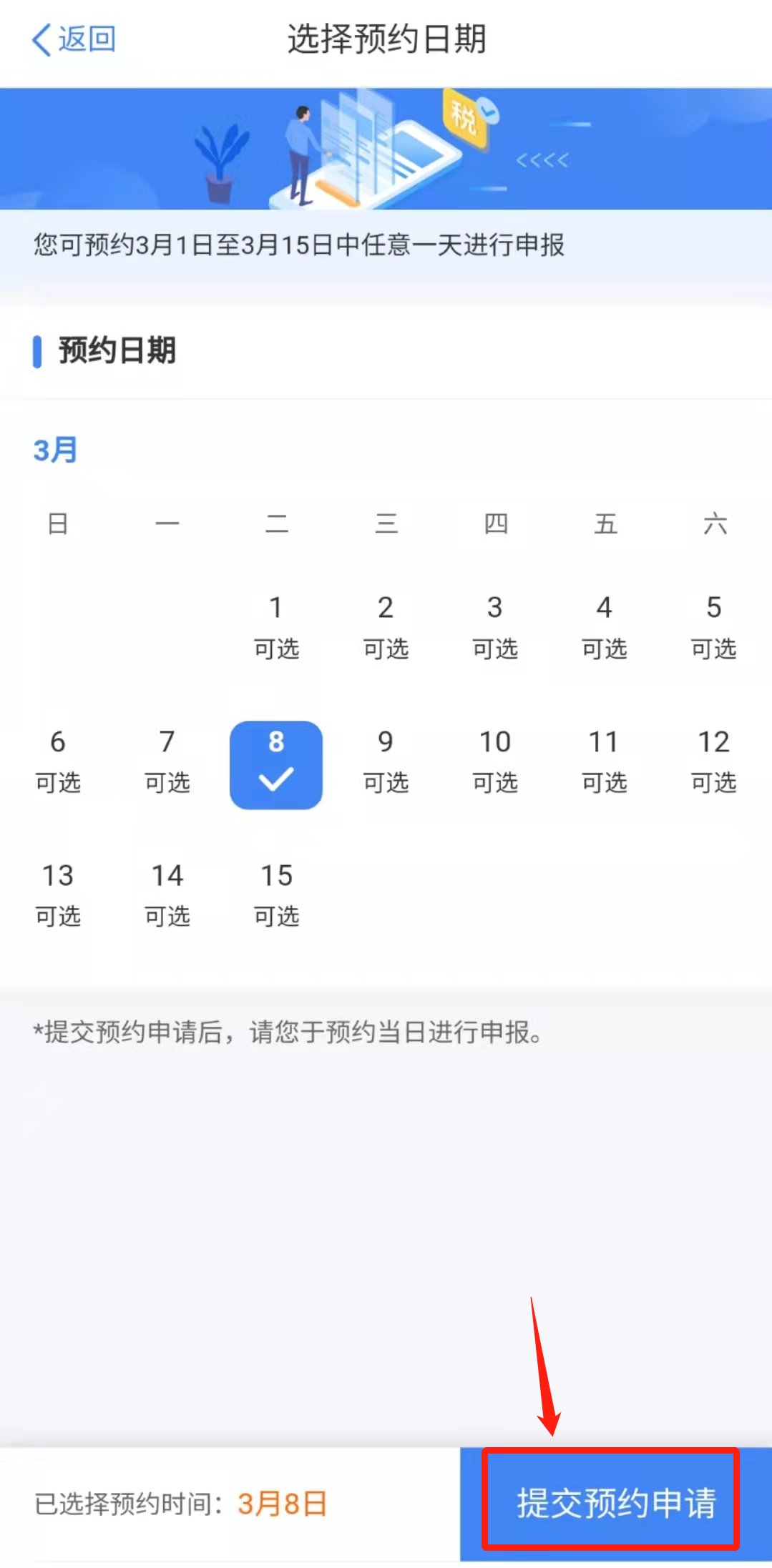 三、按照自己的需求以及无锡相关税务机关的上班时间,选择相应的办理时间,点击“提交预约”,即可预约成功