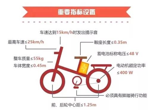2、根据官方在2018年出台的《电动自行车安全技术规范》。电动自行车需具备脚踏骑行能力,整车质量禁超55kg,最高时速不超过25km/h。此外,电动车新国标还对电动功率、蓄电池电压、防篡改、防火阻燃性能、充电器保护等方面做出了具体技术要求。