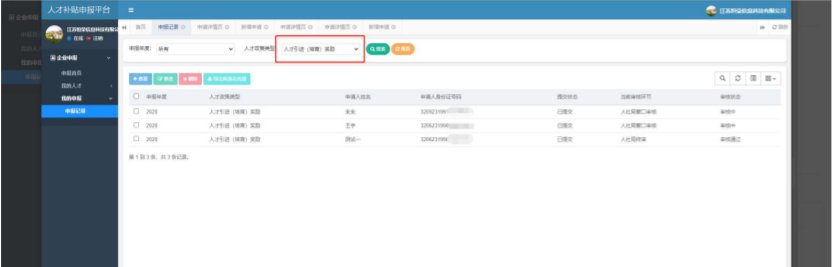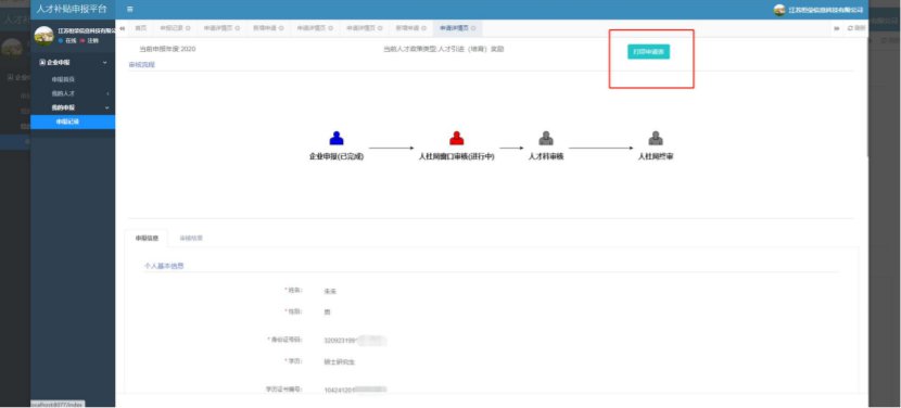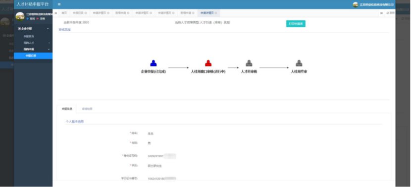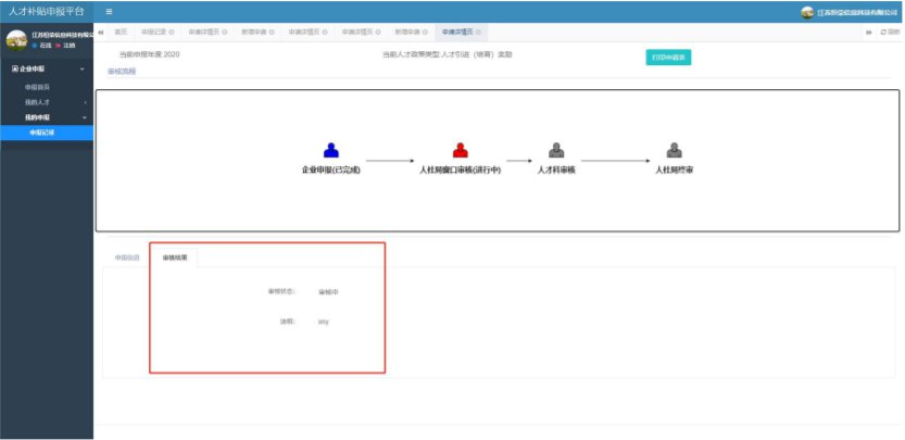 注:人才引进(培育)奖励申报提交之后,可在【我的申报】- 【申报记录】菜单下查看审核流程节点和审核结果。
