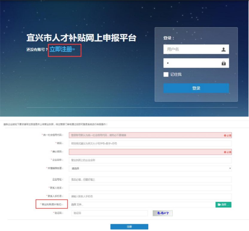 按页面提示填写企业、联系人信息,上传营业执照扫描件(图片格式),输入验证码后点击【注册】按钮,完成企业注册。注:企业提交注册后需等人社局主管科室审核通过后才能登录。