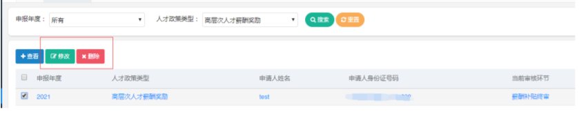删除【我的申报】【申报记录】中找到【退回】的高层次人才薪酬奖励(申报提交后只有审核退回的记录才可以进行修改),选中一条点击【修改】【删除】。