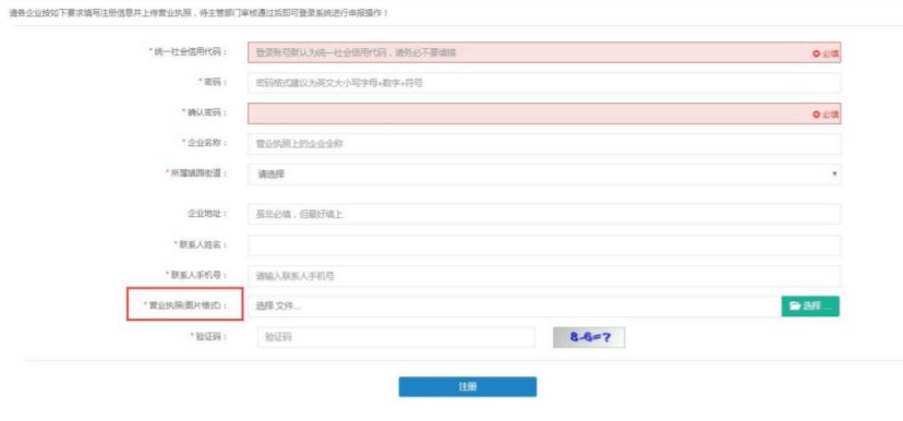按页面提示填写企业、联系人信息,上传营业执照扫描件(图片格式),输入验证码后点击【注册】按钮,完成企业注册。注:企业提交注册后需等人社局主管科室审核通过后才能登录。